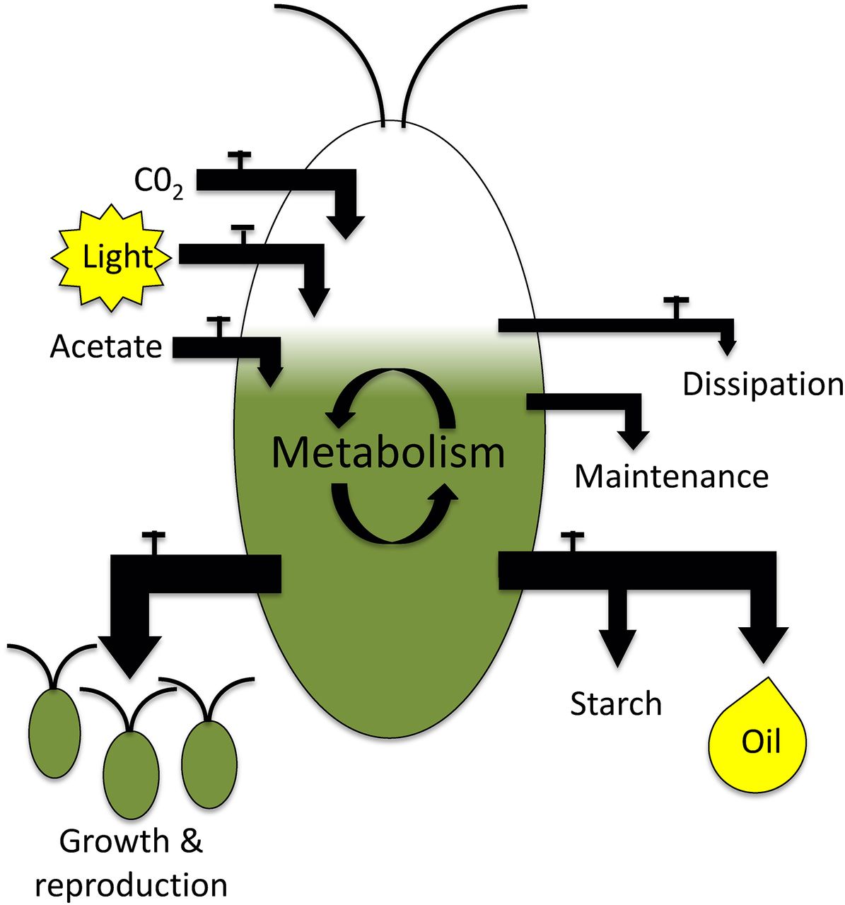 Research in the Shachar-Hill lab concerns the response of the model microalga Chlamydomonas reinhardtii to nitrogen deprivation, which induces TAG production. C. reinhardtii serves as a model alga due to its well-understood physiology, its fully sequenced genome, and the availability of numerous molecular tools such as transformation methods, transformation markers, fluorescent reporter genes, and RNAi silencing. The Shachar-Hill lab has explored the interaction between photosynthesis and carbon accumulation and energy fluxes in C. reinhardtii during nitrogen starvation. Cell growth, biomass, starch levels, lipid levels, and photosynthetic function have been measured before and during nitrogen starvation. The lab is currently exploring the lipid metabolism of C. reinhardtii during nitrogen resupply, including the fate of carbon molecules that were stored in TAG during nitrogen deprivation.